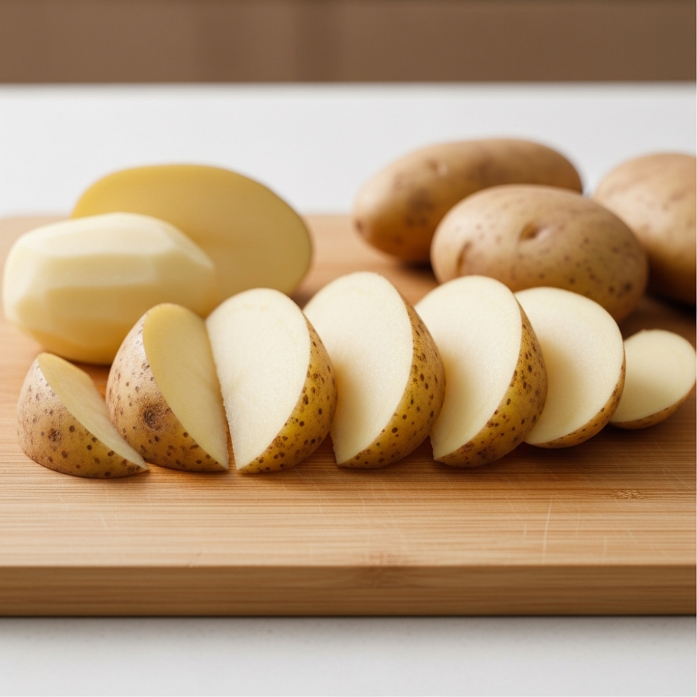 To cut a potato into wedges, slice the potato in half lengthwise. Place the cut side of the potato onto the cutting board and cut it in half again to create quarters. Repeat with the other half. Now, position each potato quarter with the cut side up and cut down the center of each quarter to create a wedge. Repeat with the other quarters until the entire potato is cut into wedges.