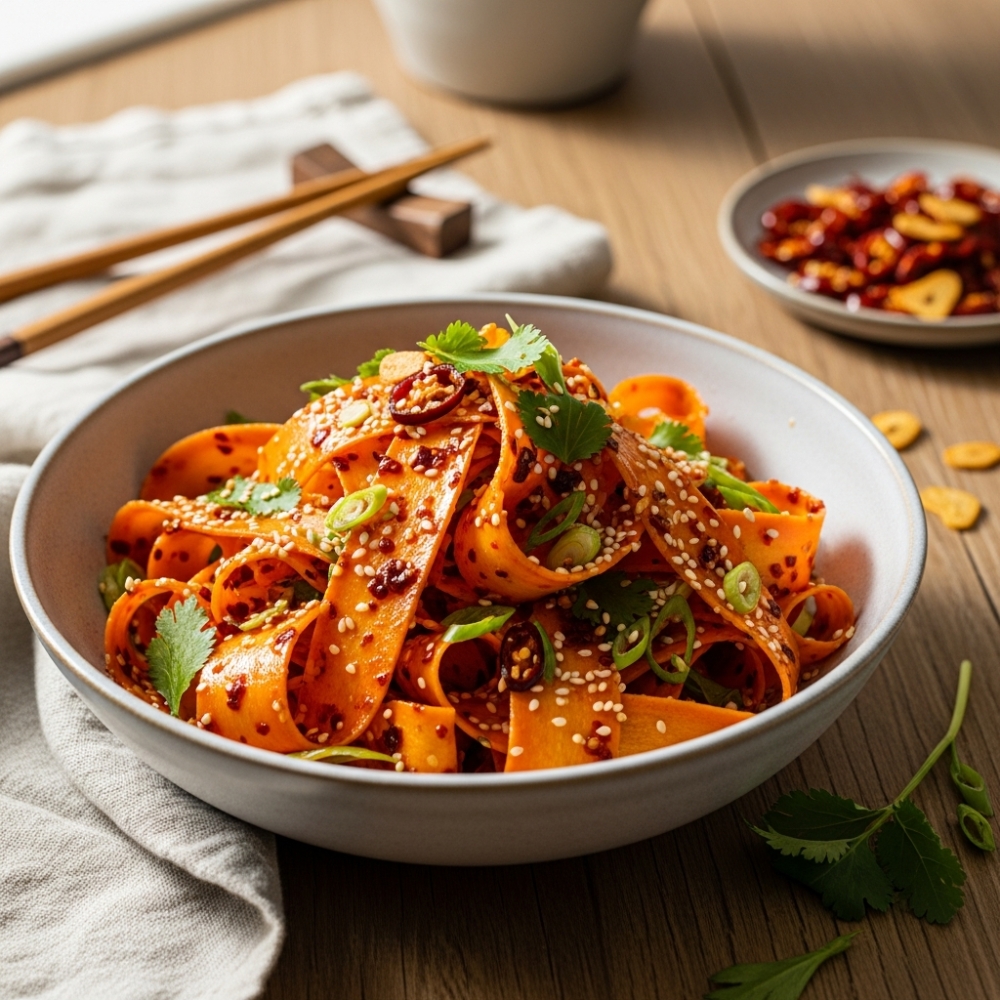 Keyword: carrot salad, carrots, chili crisp, rice vinegar, Sesame seeds, soy sauce
