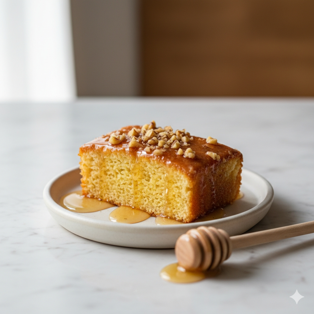 Remove cake from oven and poke holes over the surface with a toothpick. Slowly ladle the cooled honey syrup over cake. For best results, set cake aside for 4 to 6 hours to cool and absorb the syrup before slicing and serving.