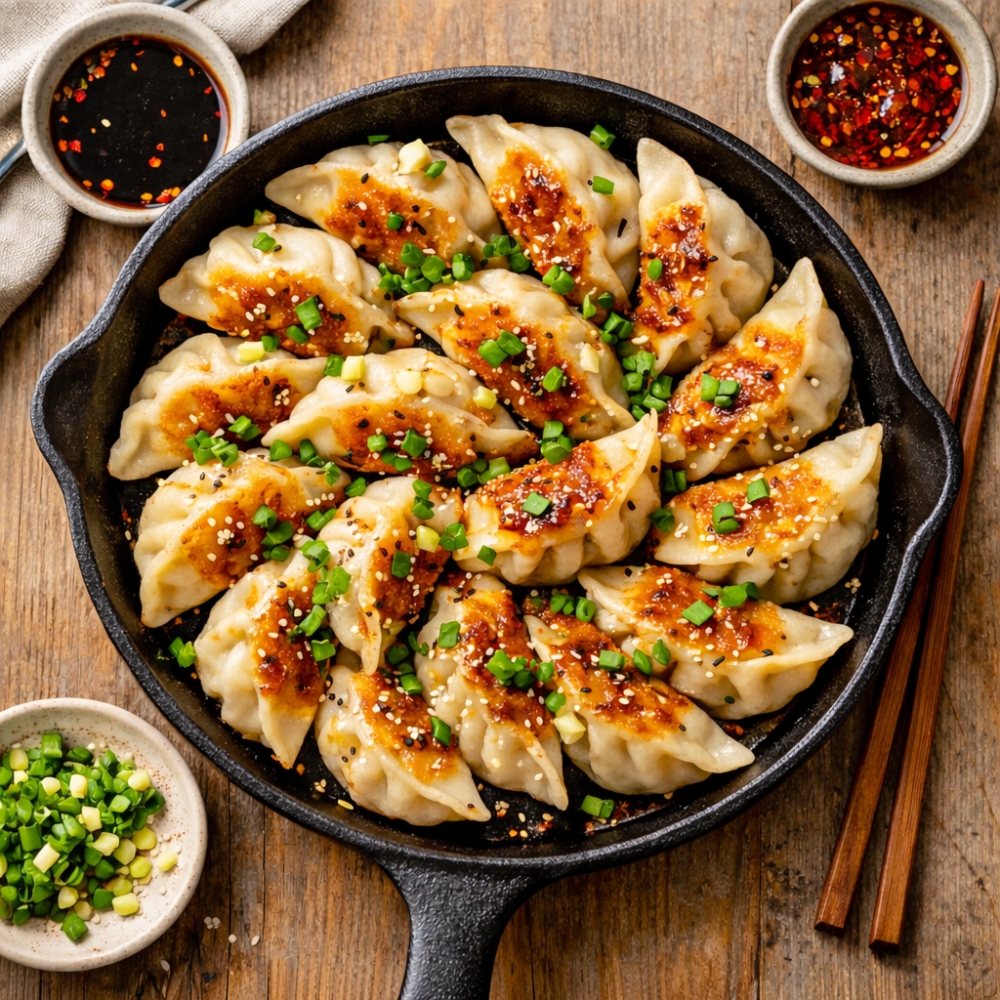 Divide dumplings and bok choy among serving plates and top with sauce from the pan. Top evenly with cilantro, green onions, sesame seeds, and drizzle with chili crunch oil.